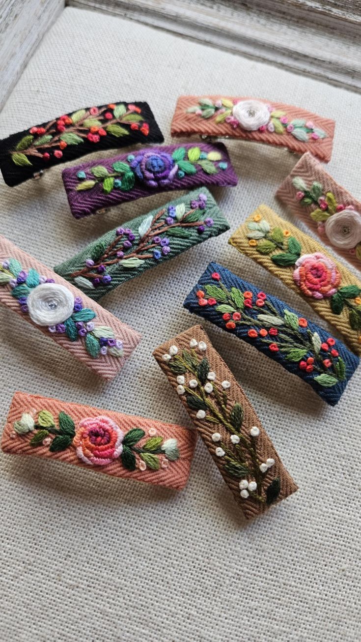 Discover the art of wearable embroidery with these exquisite handcrafted hair clips. Each piece features intricate hand-embroidered floral designs using traditional needlework techniques including French knots, satin stitch, and dimensional embroidery. Available in a stunning array of colors from classic black to soft peach, rich purple, and warm browns, each clip showcases unique botanical motifs with roses, berries, leaves, and wildflowers. The textured herringbone and twill fabric base adds depth and vintage charm. Perfect for adding artisan elegance to any hairstyle. Discover the art of wearable embroidery with these exquisite handcrafted hair clips. Each piece features intricate hand-embroidered floral designs using traditional needlework techniques including French knots, satin stitch, and dimensional embroidery. Available in a stunning array of colors from classic black to soft peach, rich purple, and warm browns, each clip showcases unique botanical motifs with roses, berries, leaves, and wildflowers. The textured herringbone and twill fabric base adds depth and vintage charm. Perfect for adding artisan elegance to any hairstyle. Discover the art of wearable embroidery with these exquisite handcrafted hair clips. Each piece features intricate hand-embroidered floral designs using traditional needlework techniques including French knots, satin stitch, and dimensional embroidery. Available in a stunning array of colors from classic black to soft peach, rich purple, and warm browns, each clip showcases unique botanical motifs with roses, berries, leaves, and wildflowers. The textured herringbone and twill fabric base adds depth and vintage charm. Perfect for adding artisan elegance to any hairstyle.Discover the art of wearable embroidery with these exquisite handcrafted hair clips. Each piece features intricate hand-embroidered floral designs using traditional needlework techniques including French knots, satin stitch, and dimensional embroidery. Available in a stunning array of colors from classic black to soft peach, rich purple, and warm browns, each clip showcases unique botanical motifs with roses, berries, leaves, and wildflowers. The textured herringbone and twill fabric base adds depth and vintage charm. Perfect for adding artisan elegance to any hairstyle.Discover the art of wearable embroidery with these exquisite handcrafted hair clips. Each piece features intricate hand-embroidered floral designs using traditional needlework techniques including French knots, satin stitch, and dimensional embroidery. Available in a stunning array of colors from classic black to soft peach, rich purple, and warm browns, each clip showcases unique botanical motifs with roses, berries, leaves, and wildflowers. The textured herringbone and twill fabric base adds depth and vintage charm. Perfect for adding artisan elegance to any hairstyle.Discover the art of wearable embroidery with these exquisite handcrafted hair clips. Each piece features intricate hand-embroidered floral designs using traditional needlework techniques including French knots, satin stitch, and dimensional embroidery. Available in a stunning array of colors from classic black to soft peach, rich purple, and warm browns, each clip showcases unique botanical motifs with roses, berries, leaves, and wildflowers. The textured herringbone and twill fabric base adds depth and vintage charm. Perfect for adding artisan elegance to any hairstyle.Discover the art of wearable embroidery with these exquisite handcrafted hair clips. Each piece features intricate hand-embroidered floral designs using traditional needlework techniques including French knots, satin stitch, and dimensional embroidery. Available in a stunning array of colors from classic black to soft peach, rich purple, and warm browns, each clip showcases unique botanical motifs with roses, berries, leaves, and wildflowers. The textured herringbone and twill fabric base adds depth and vintage charm. Perfect for adding artisan elegance to any hairstyle.Discover the art of wearable embroidery with these exquisite handcrafted hair clips. Each piece features intricate hand-embroidered floral designs using traditional needlework techniques including French knots, satin stitch, and dimensional embroidery. Available in a stunning array of colors from classic black to soft peach, rich purple, and warm browns, each clip showcases unique botanical motifs with roses, berries, leaves, and wildflowers. The textured herringbone and twill fabric base adds depth and vintage charm. Perfect for adding artisan elegance to any hairstyle.Discover the art of wearable embroidery with these exquisite handcrafted hair clips. Each piece features intricate hand-embroidered floral designs using traditional needlework techniques including French knots, satin stitch, and dimensional embroidery. Available in a stunning array of colors from classic black to soft peach, rich purple, and warm browns, each clip showcases unique botanical motifs with roses, berries, leaves, and wildflowers. The textured herringbone and twill fabric base adds depth and vintage charm. Perfect for adding artisan elegance to any hairstyle.Discover the art of wearable embroidery with these exquisite handcrafted hair clips. Each piece features intricate hand-embroidered floral designs using traditional needlework techniques including French knots, satin stitch, and dimensional embroidery. Available in a stunning array of colors from classic black to soft peach, rich purple, and warm browns, each clip showcases unique botanical motifs with roses, berries, leaves, and wildflowers. The textured herringbone and twill fabric base adds depth and vintage charm. Perfect for adding artisan elegance to any hairstyle.Discover the art of wearable embroidery with these exquisite handcrafted hair clips. Each piece features intricate hand-embroidered floral designs using traditional needlework techniques including French knots, satin stitch, and
